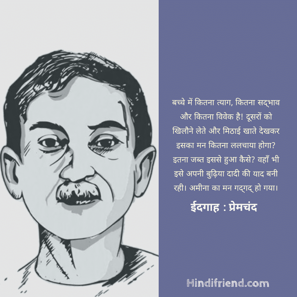 बुढ़िया का क्रोध तुरन्त स्नेह में बदल गया, और स्नेह भी वह नहीं, जो प्रगल्भ होता हे और अपनी सारी कसक शब्दों में बिखेर देता है। यह मूक स्नेह था, खूब ठोस, रस और स्वाद से भरा हुआ। बच्चे में कितना व्याग, कितना सदभाव और कितना विवेक है! दूसरों को खिलौने लेते और मिठाई खाते देखकर इसका मन कितना ललचाया होगा? इतना जब्त इससे हुआ कैसे? वहाँ भी इसे अपनी बुढ़िया दादी की याद बनी रही। अमीना का मन गदगद हो गया।